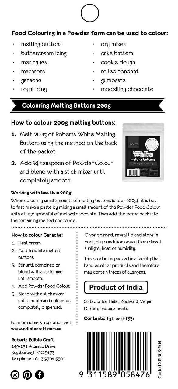 You can also use these powders to colour icings including: Ready to Roll Fondant icing, butter frostings, modelling paste, flower paste.