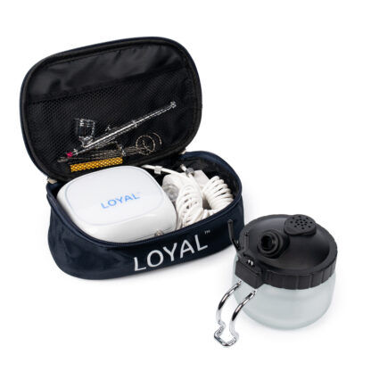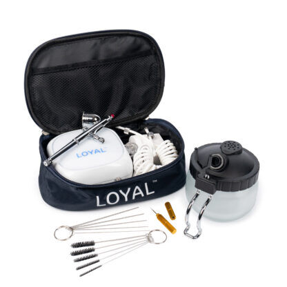 The LOYAL Complete Airbrush Bundle includes everything you need to get started with airbrushing — Airbrush Kit, Cleaning Set, Cleaning Jar, and Canvas Bag.